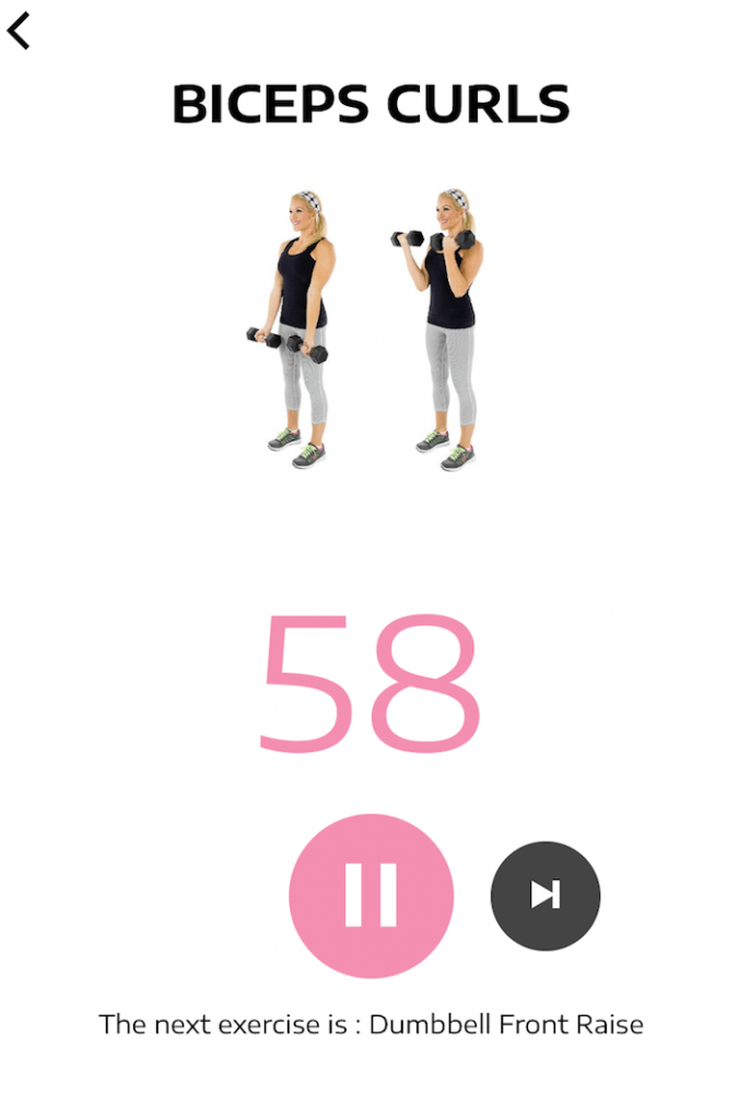 For each exercise the app shows an example video of how to preform the exercise correctly and safely. Within any given exercise during your workout there is a timer that counts down and rings when the exercise has been completed. If there is a certain exercise you don’t like or that doesn’t work for your body then you can skip or if you need a break you can just press the pause button.